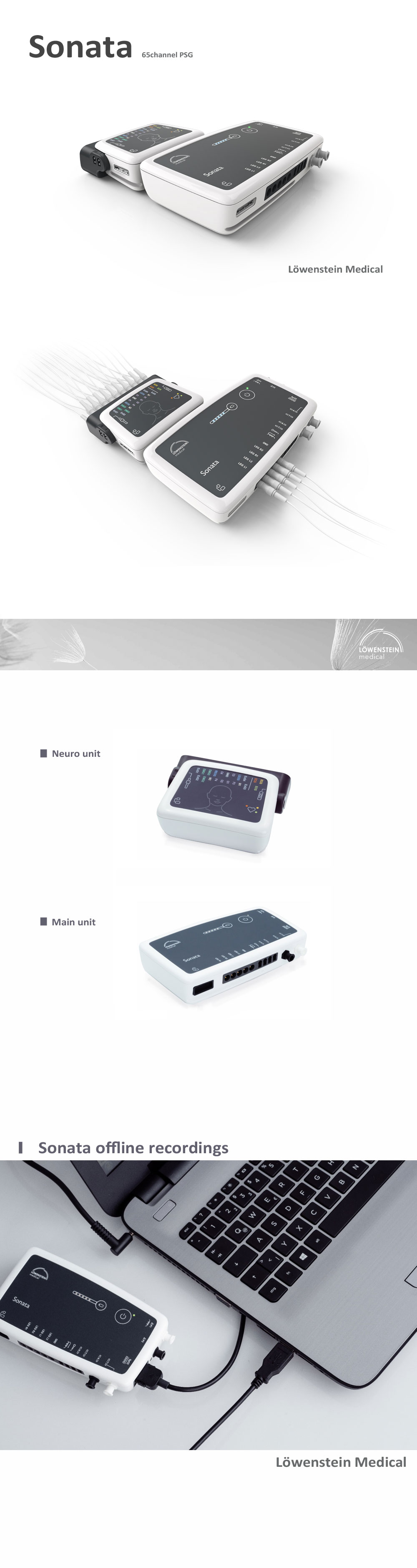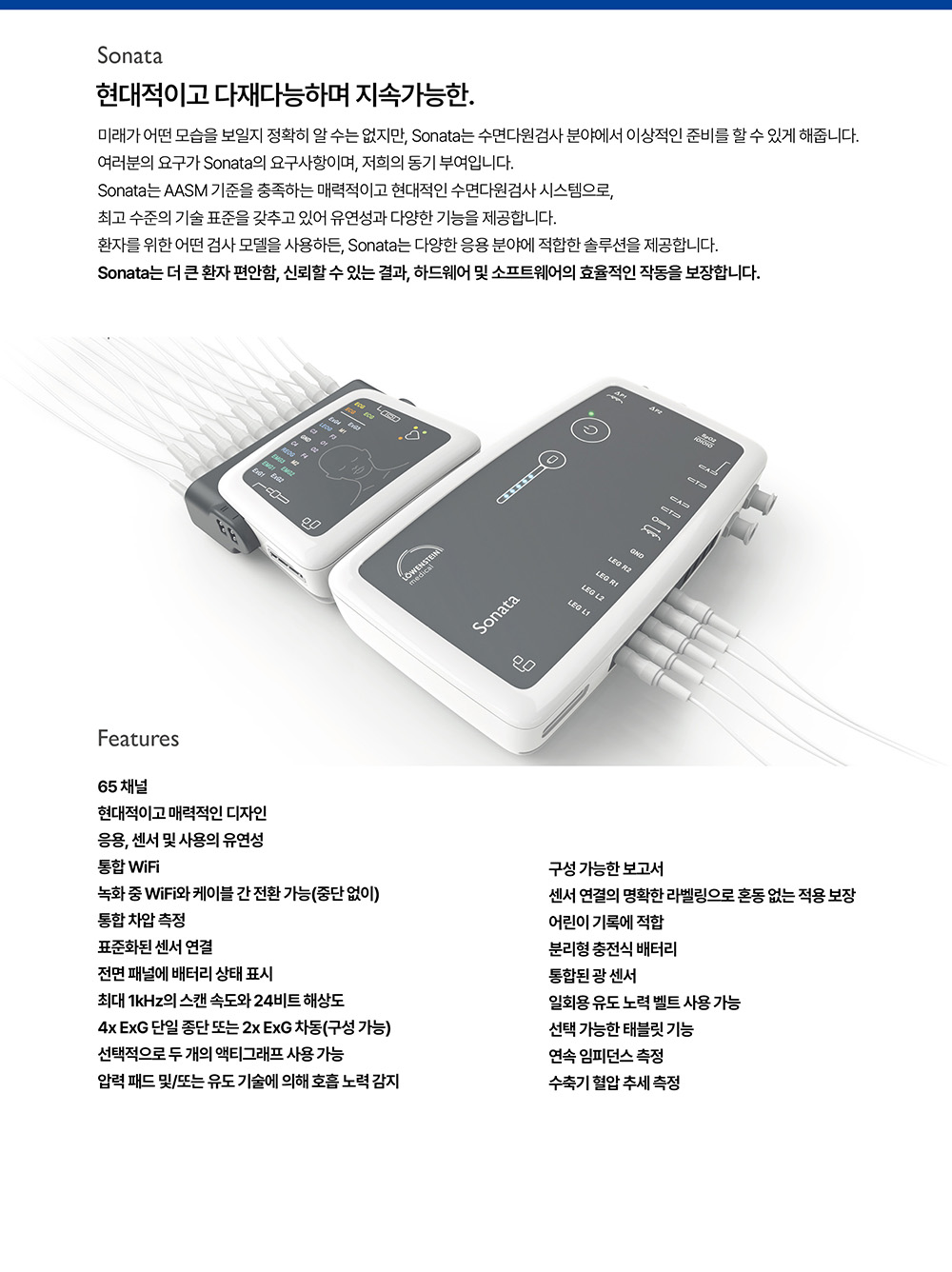 | 용도 | 65 channels PSG 수면평가장치 / EOG, EEG, ECG, EMG 또는 LEG를 위한 자유롭게 구성할 수 있는 두 개의 ExG 채널 |