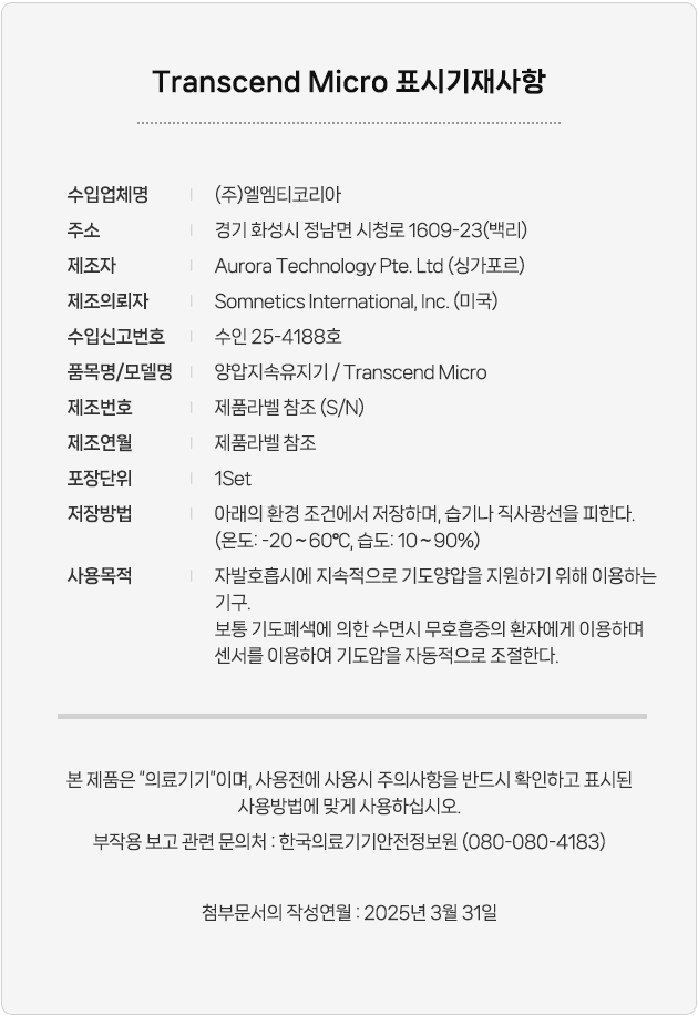 - Transcend Micro는 치료 램프 및 압력에 사용하기 전에 숙련된 서비스 제공자가 설정하고 조정해야 합니다.