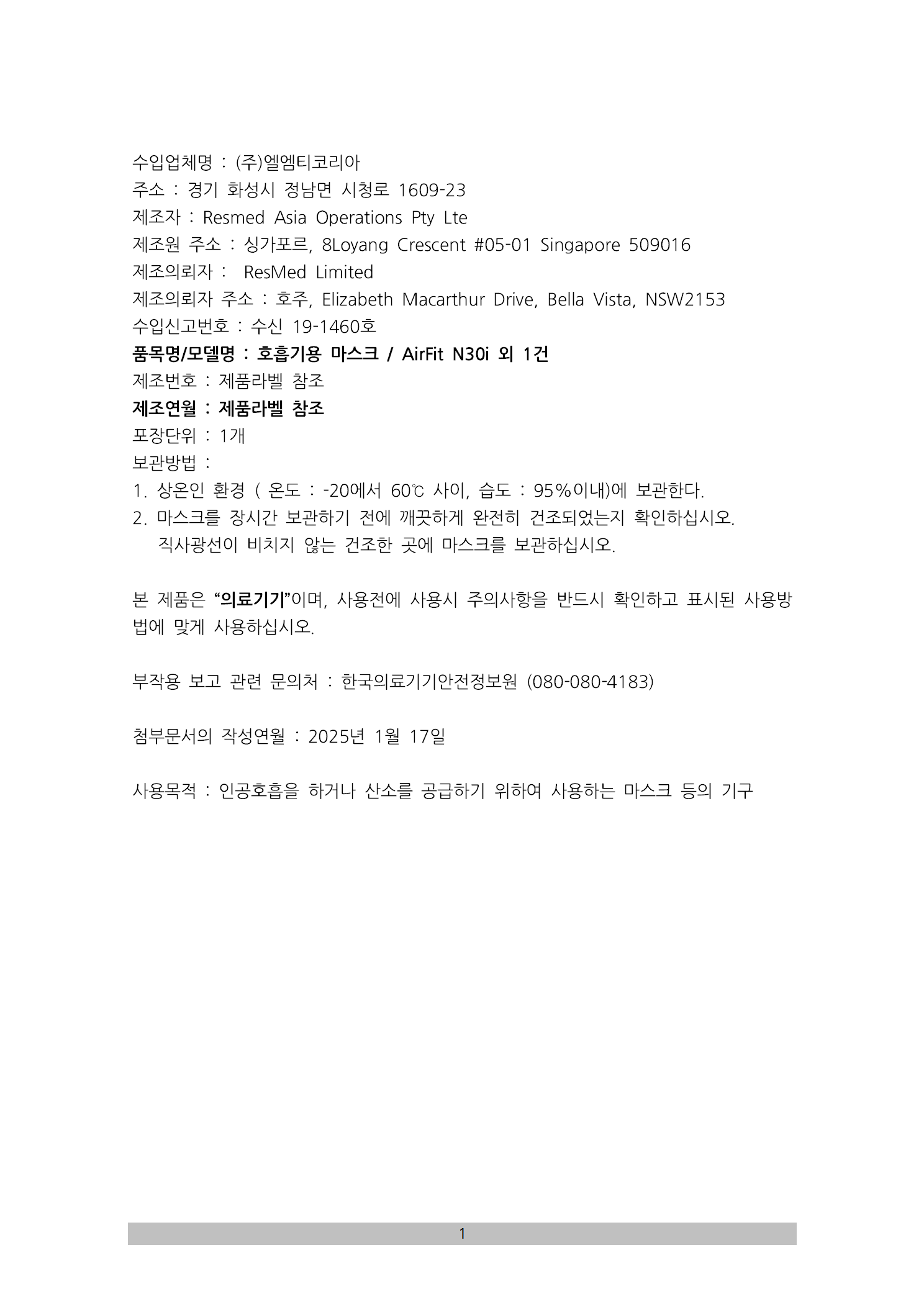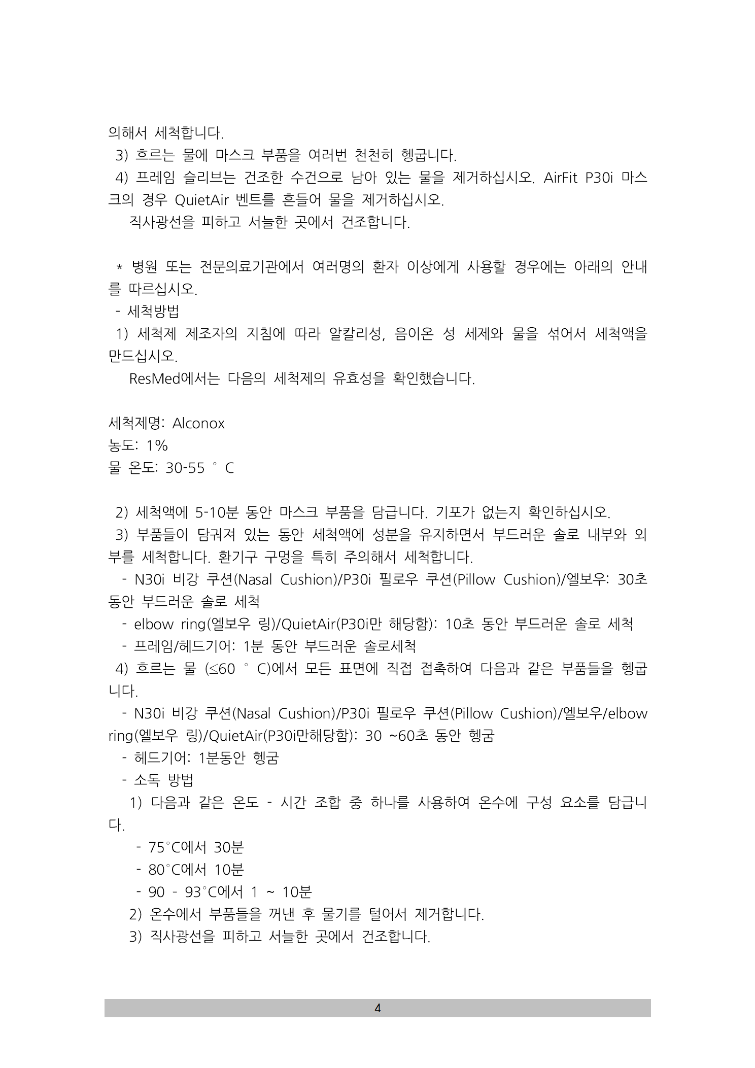 AirFit 30 시리즈 사용자설명서 (호흡기용 마스크, 수신 19-1460호)