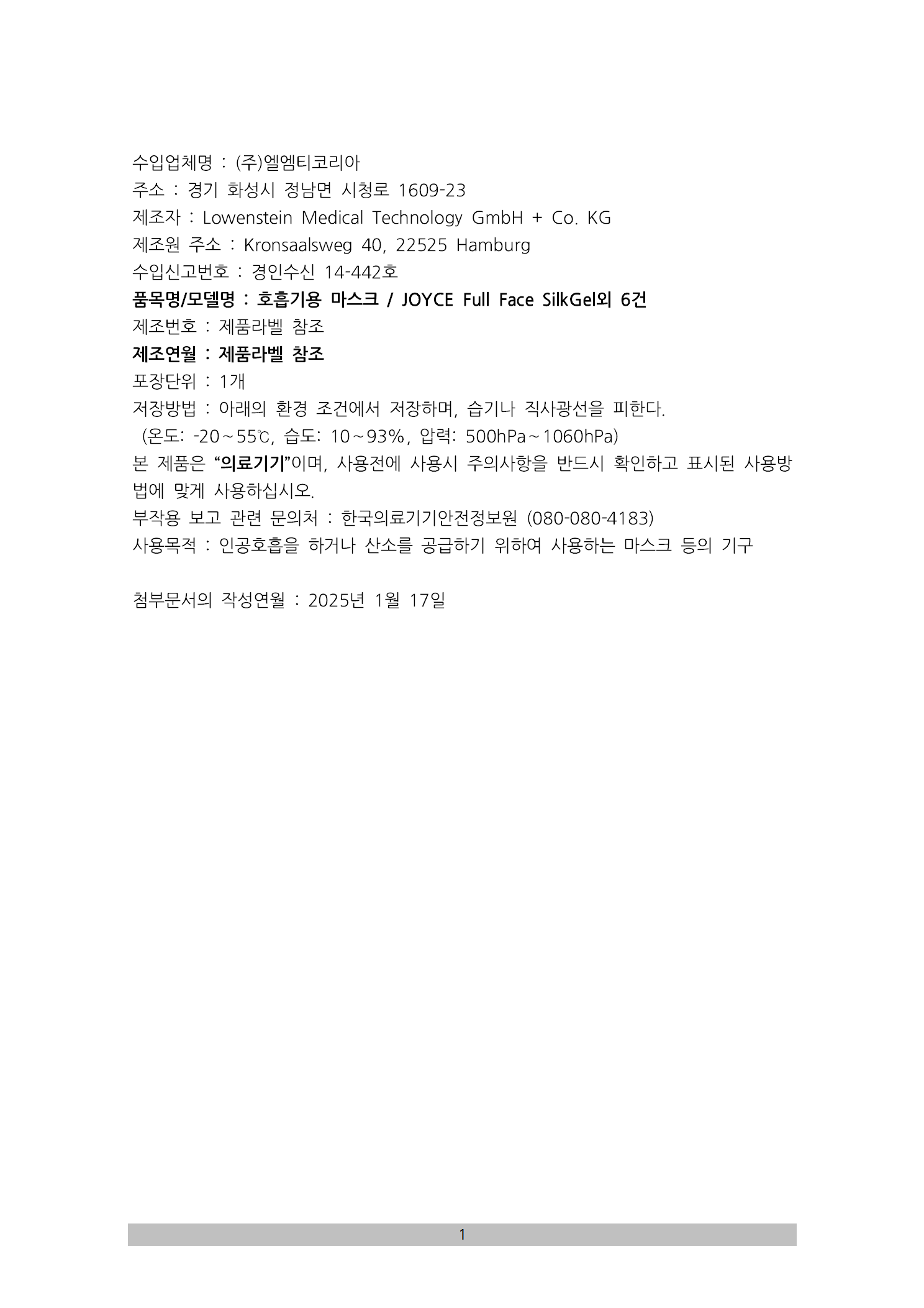 JOYCE 시리즈 사용자설명서 (호흡기용 마스크, 경인수신 14-442호)